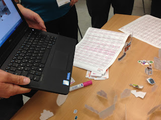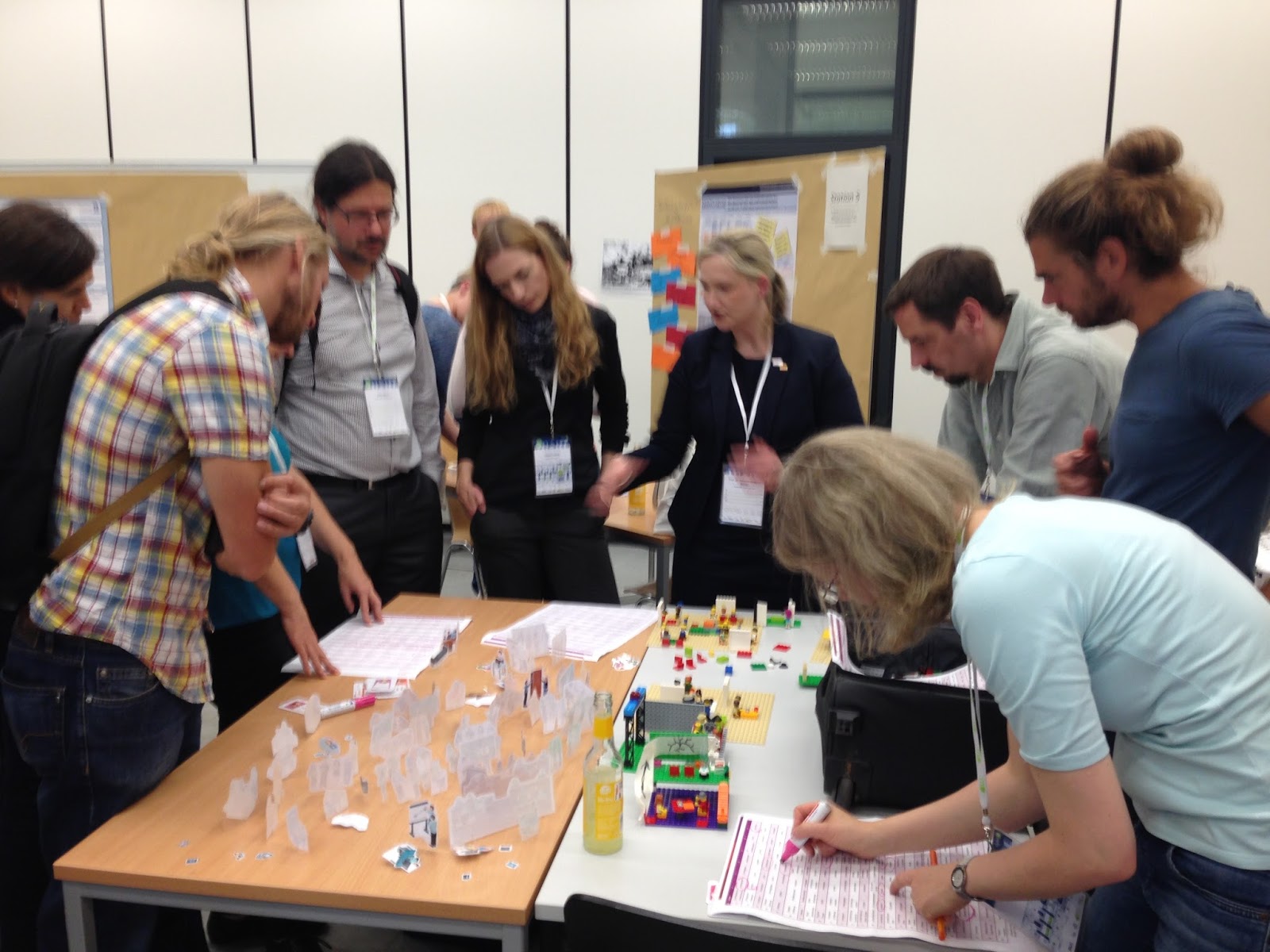 Mobile Räume Im DisQ-Space-Part mit den TH-ProfessorInnen Yvonne-Beatrice-Böhler und Christian Kohls hatten wir dann viel aufgefahren: Ein großer Koffer, planten einen einen Drucker zu nutzen, Bilder der Blogstöckchensammlung aus diesem Blog waren auf DINA4 ausgedruckt und aufgehangen, ein großes Poster der Unterrichtstaxonomie von Baumgartner im Hintergrund und als Handout zum Einsortieren / als Anregung für Lehr- und Lernraumkonstruktionen, Impulskarten. Puh. War aber nicht erschlagend, sondern wurde sehr unterschiedlich von den Menschentrauben an unserem (an den anderen Stationen des DisQ-Spaces sammelten sich immer ähnlich viele Menschen) Stand genutzt. Der Ansatz, mit einem Kurzvortrag einzusteigen und dabei verschiedene Anregungen zu geben, einen Lehr-Lernraum zu entwickeln, hat sehr unterschiedliche, kreative Ideen hervorgebracht: So spiegelten sich in einem Raum-Setting mit beweglichen Objekten die verschiedenen Phasen des Think-Pair-Share, in einem anderen wurden virtuelle Räume und analoge Räume als zwei Raumebenen miteinander verknüpft (inkl. Rutsche) und die Auswirkungen eines beweglichen, fahrenden Raumes auf Lernprozesse und Austausch wurde von den Teilnehmenden thematisiert.